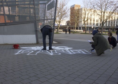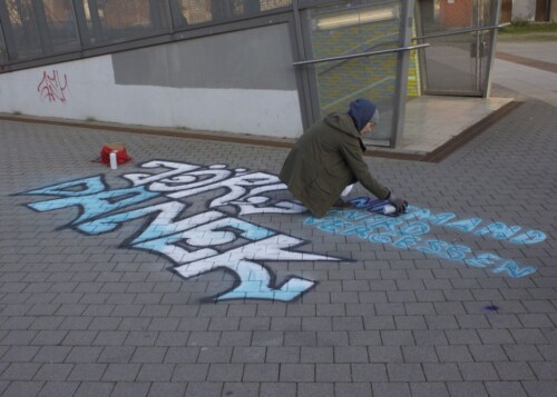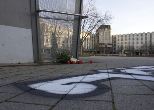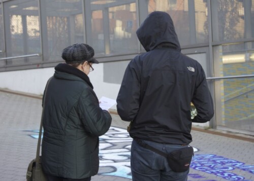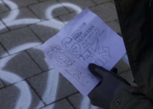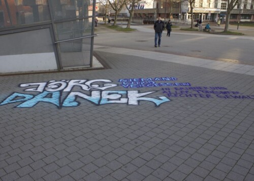Während dieser Kunstaktion wurden Flyer an Passant*innen verteilt, die zum einen auf das Schicksal Jörg Daneks aufmerksam machten und zum anderen als Aufruf dienten, Angehörige und Freund*innen des Getöteten zu finden. Im Anschluss sprach eine Vertreterin des Initiativkreises „Würdiges Gedenken“ zum rechten Motiv und Tathergang des brutalen Tötungsverbrechens. Daraufhin entzündeten die Teilnehmer*innen der Kundgebung Kerzen und legten diese zusammen mit einem Blumengesteck an dem Ausgang der S-Bahnhaltestelle nieder.